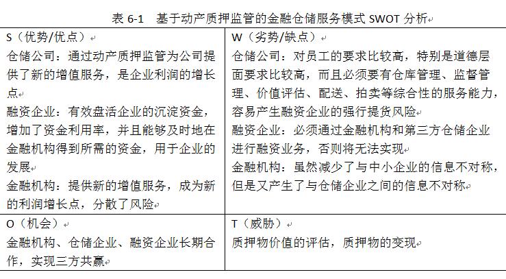SWOT分析即強弱危機綜合分析法,是一種企業競爭態勢分析方法,是市場營銷的基礎分析方法之一,通過評價企業的優勢(Stengths)、劣勢(Weaknesses)、競爭市場上的機會(Opportunities)和威脅(Threats),用以在制定企業的發展戰略前對企業進行深入全面的分析以及競爭優勢的定位。基于動產質押監管模式的SWOT分析見表6-1。