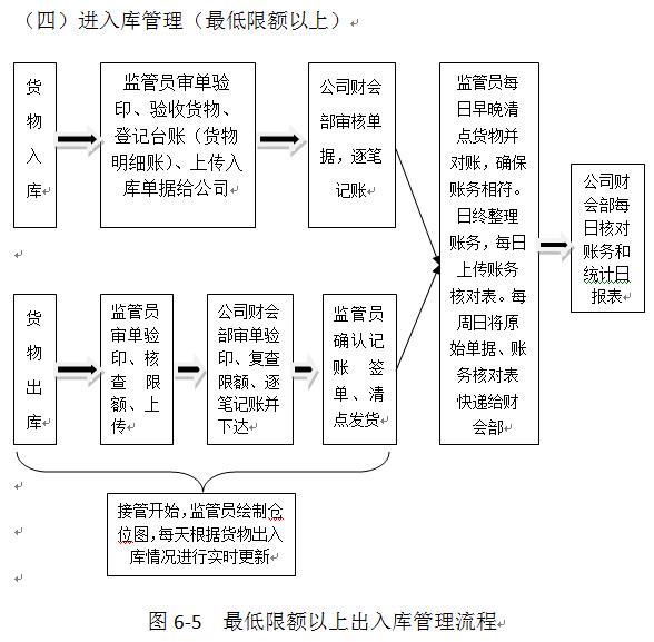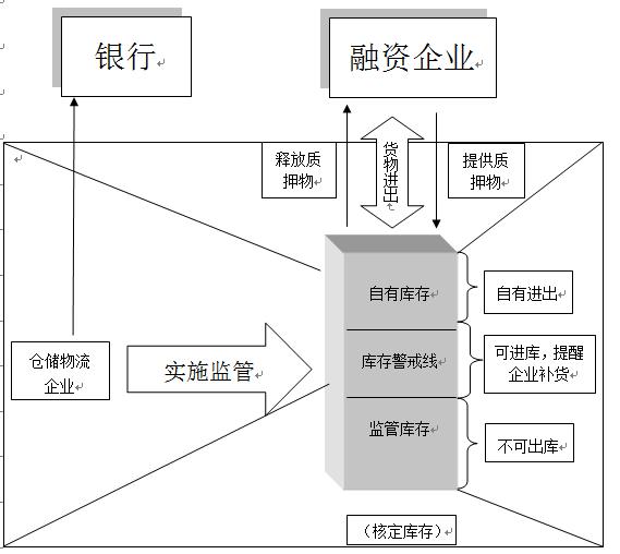 存量警戒線一般應高于該筆質物總量的20%-30%,并在制定的金融倉儲監管人員的臺賬和計算機業務管理系統中予以明顯標記。如圖6-4所示,對于倉庫中的自由庫存物是可以自由提取或置換的,當質物的置換和出庫使物質的存量接近或達到事先設置的存量警戒線時,金融倉儲管理公司監督人應當通知質權人停止發貨,并且提醒企業進行補貨。如果出質人需要對圖示中的監管庫存進行置換,出質人須向質權人銀行提出申請,根據銀行出具的置換指示才可以進行置換。