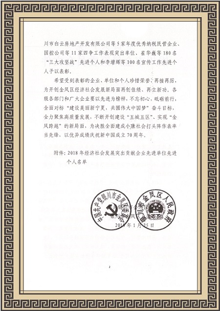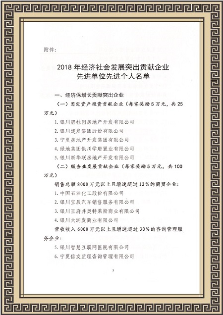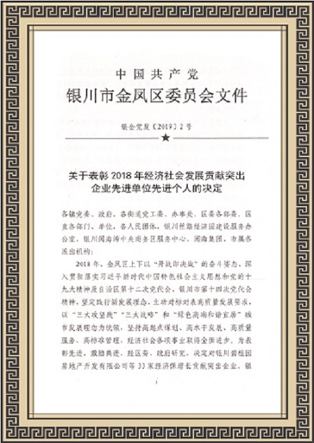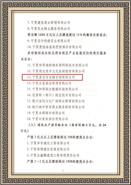 近日,銀川(chuan)市金鳳區人民政府(fu)對金鳳區經濟社(she)會發展作(zuo)出突出貢獻的(de)2018年(nian)金(jin)鳳區優秀(xiu)企業、先(xian)進個人予(yu)以表彰,總共(gong)有(you)(you)38家企業、11家單位、280名(ming)先(xian)進個人獲評(ping),嘉寶信金(jin)融倉儲榜上有(you)(you)名(ming)。