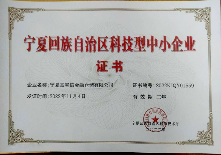 喜報:寧夏嘉寶信金融倉儲有限公司榮獲”科技型中小企業榮譽資質“